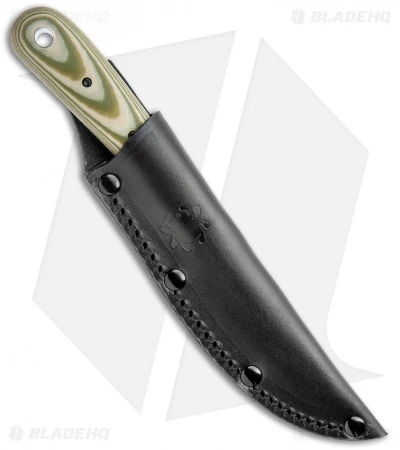 This distributor exclusive Bow River fixed blade has a layered OD green and gray G-10 handle with a black finished blade.