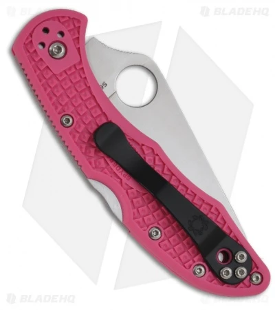 This Spyderco Delica 4 knife has a pink FRN handle and a full-flat ground VG-10 stainless steel blade that is satin finished with a plain cutting edge.