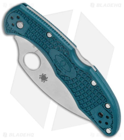 This Spyderco Delica 4 knife has a lightweight blue FRN handle and a Bohler K390 steel blade in a wharncliffe style with a plain cutting edge.