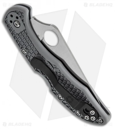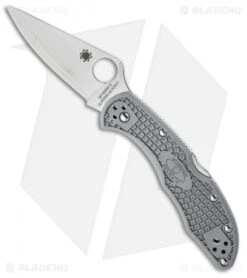 This Spyderco Delica 4 knife has a Gray FRN handle and a full-flat ground Aogami Super Blue steel laminated blade that is satin finished with a plain cutting edge.