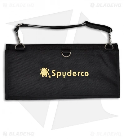 Constructed from heavy-denier polyester Cordura, the pack has eighteen deep pockets sized to hold even larger folders. Each pocket is fronted with a clear plastic window for viewing knives tucked inside. It tri-folds over and seals closed by way of a Velcro strip running the width of the pack. The knives remain secure and separated in their pockets and cannot rub or scratch against each other. An adjustable length shoulder strap attaches with two durable steel D-rings letting you hang the pack for display on a wall or sling it over your shoulder to take with you. Spyderco’s name and bug logo are embroidered in gold thread on the closing flap. Available in black.