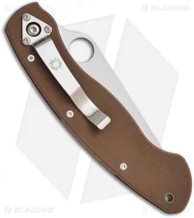 This sprint-run ‘Millie’ has a large Spyderco Round Hole for quick deployment and for use with gloves. Texturing above the hole hold the thumb in contact with the blade’s spine during cutting for confident control over the sharpened edge. The handle scales are Earth Brown G-10 with the lock’s liner nested (inlayed) directly into the scale, pumping up lock strength without the addition of bulky liners. Spacers between the scales create a gap running the handle’s full length exposing the inside workings for inspection and cleaning. The handle flares slightly at the front end creating a finger choil and at the butt end, which keeps the knife from slipping forward or backward in the hand while sawing or making tough or aggressive cuts. A contoured black metal clip is set for right-hand tip-down carry. Spyderco used premium Carpenter CTS-XHP steel for this sprint-run Military, limited quantities.
