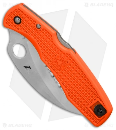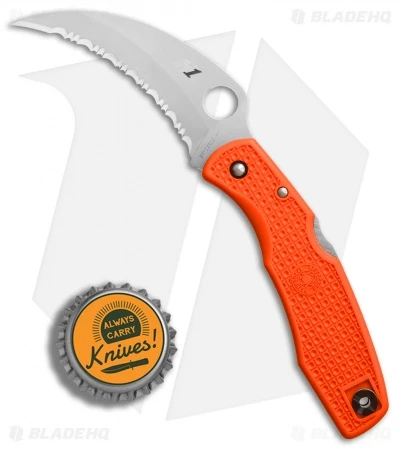 Spyderco’s SpyderHawk Salt has a hawkbill blade that utilizes H-1* steel for 100% rust free performance. The hollow-ground H-1 blade, rust-free internal components and a titanium pocket clip are naturally geared toward water applications. The handle is easy to see orange FRN (fiberglass reinforced nylon) with Spyderco’s Volcano Grip® texturing. Handle texture supports gripping the knife wearing gloves or in wet, slippery conditions. The reversible left or right tip-up carry pocket clip and lock back design make this knife great for left or right handed users. The piped lanyard hole through the handle is ready for a thong or cord.